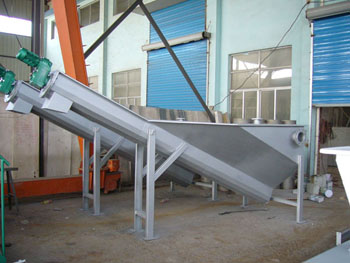 砂水混合物從頂部的法蘭接管進(jìn)入儲液箱內(nèi)。箱內(nèi)專門設(shè)計的散水盤使水匯集于下水槽。砂水混合夜中,砂石逐漸沉淀于下部的螺旋u形槽內(nèi)?招膸铰菪徛D(zhuǎn)砂礫推向上出口,自然脫水排除。